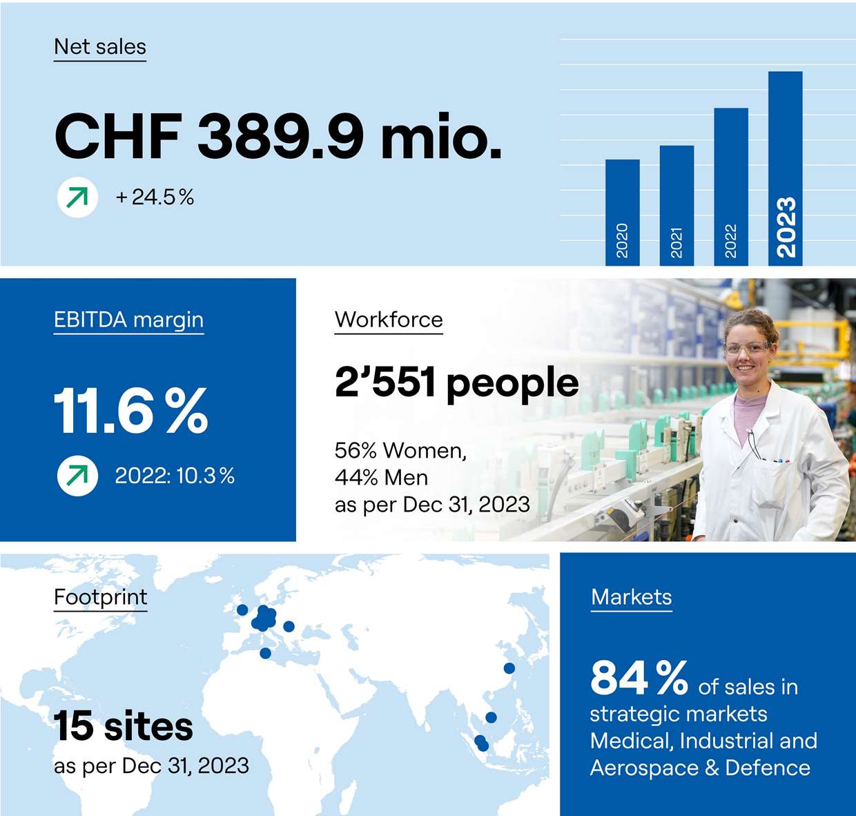 Die Cicor Gruppe steigerte den Umsatz 2023 gegenüber dem Vorjahr um 24.5% auf einen neuen Höchstwert von CHF 389,9 Mio. (2022: CHF 313,2 Mio.). Während das organische Wachstum mit 11,1% und Akquisitionen mit 16,4% zum Umsatzwachstum beitrugen, bremste die Aufwertung des Schweizer Frankes das Umsatzwachstum um –3,0%. Trotz konjunkturellem Gegenwind konnte Cicor den rekordhohen Auftragsbestand weiter ausbauen.