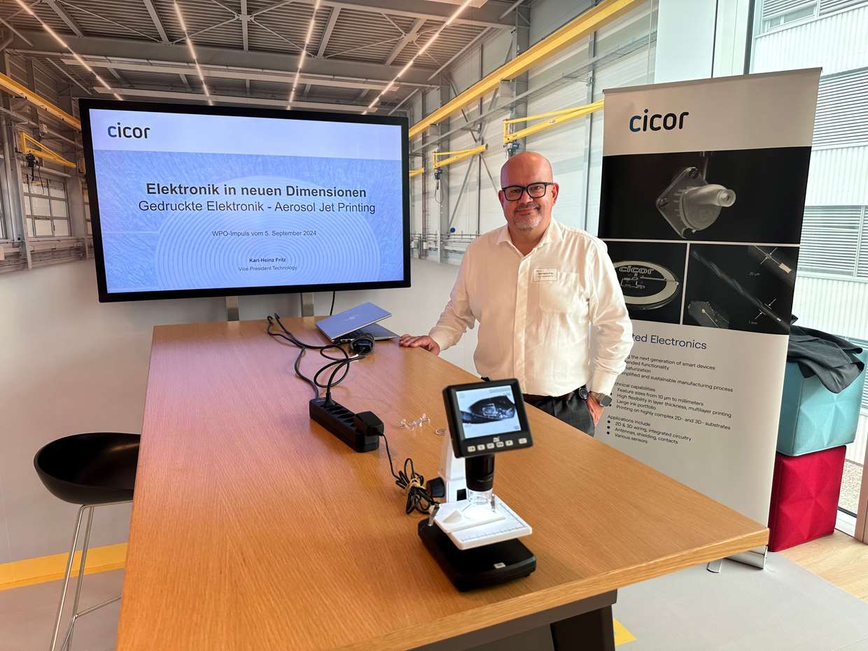 Karl-Heinz Fritz, Vizepräsident für Technologie, hatte das Vergnügen, die Aerosol-Jet-Printing-Technologie auf einer Innovationsinsel von WPO-Impuls in Uzwil, Schweiz, vorzustellen.