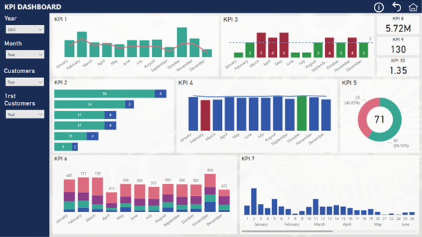 The main objective of this project was to consolidate the company’s key performance indicators (KPI) in one place, while automating updates as much as possible to eliminate manipulations across various files. Power BI software is the ideal tool to meet this requirement, as it allows consolidating data from various sources into a single location and offers a large range of visualizations.