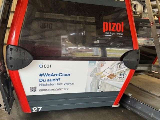 We are starting the 2024/25 season with a special promotion: a gondola lift is travelling from Wangs to the Pizol – and is carrying an eye-catching advertisement to attract employees. This advertising campaign is original and hopefully also effective: